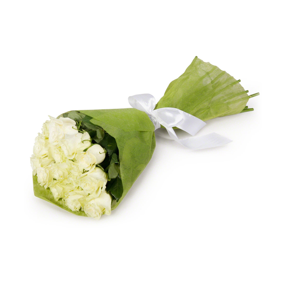 Элегантный букет из белоснежных роз в благородной фетровой упаковке — воплощение чистоты и божественной гармонии.